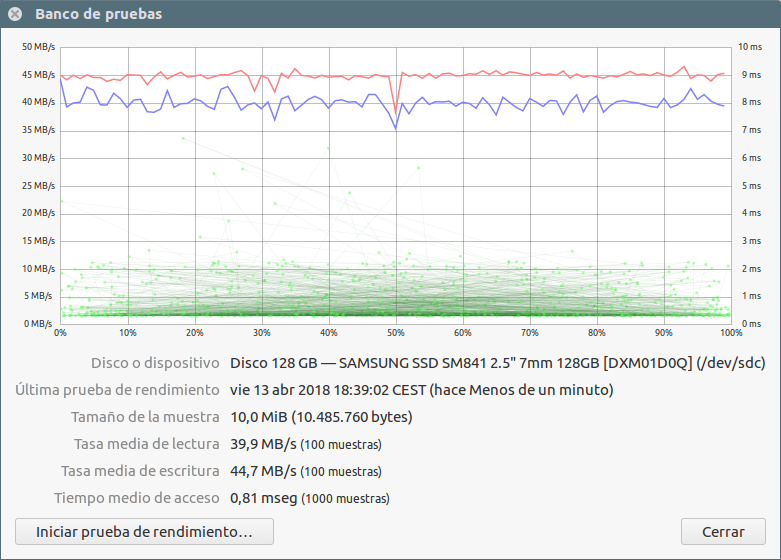 Para las pruebas voy a utilizar la herramienta Discos que está disponible para Ubuntu y Debian, en realidad el nombre exacto es gnome-disk-utility
