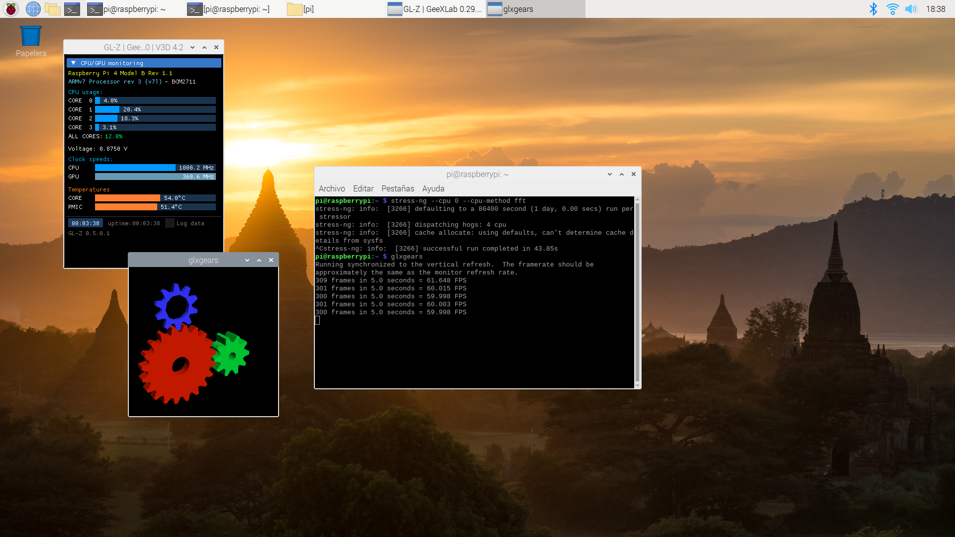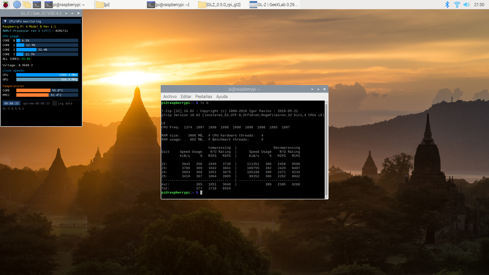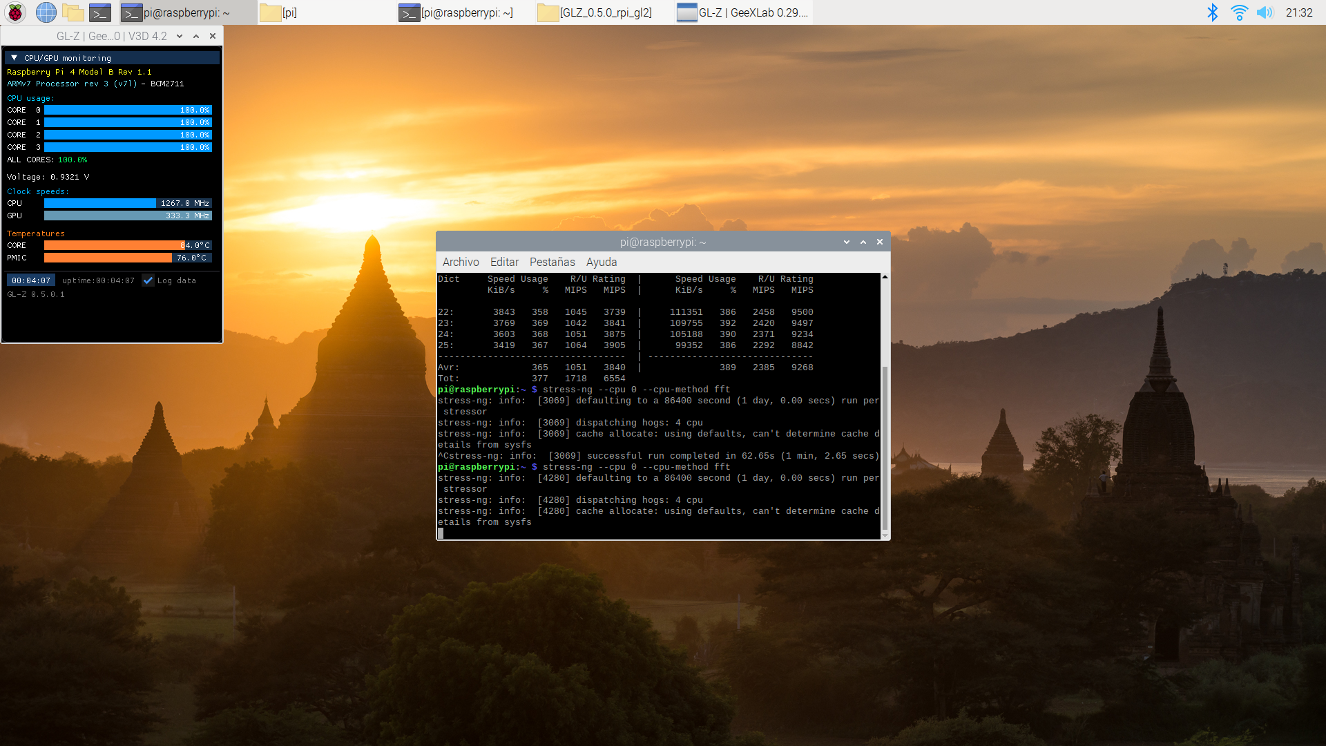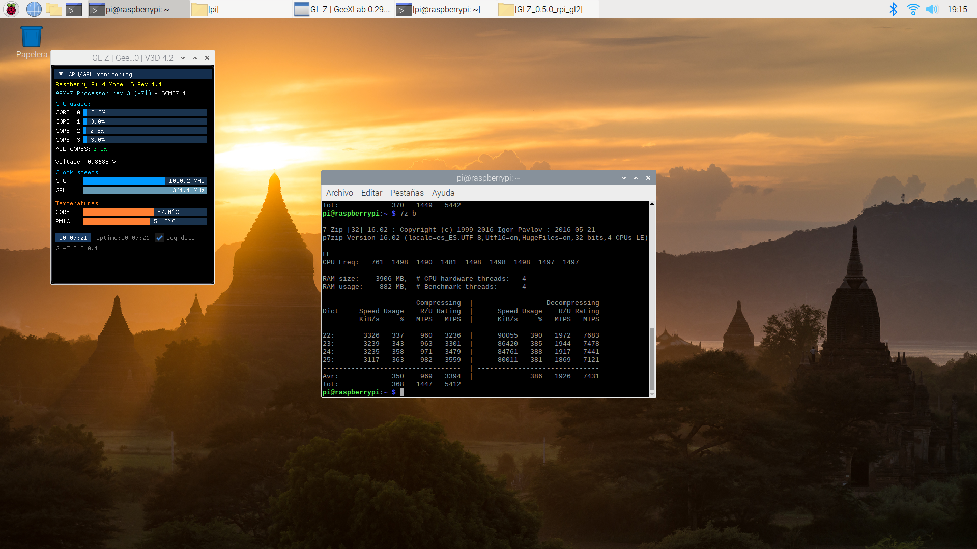 También vamos a comprobar cómo de estable es al forzar y hacer que se caliente más con tres aplicaciones: stress-ng, glxgears (incluido en el paquete mesa-utils y 7z (con la opción b que hace un benchamark con el programa de compresión de archivos p7zip-full).