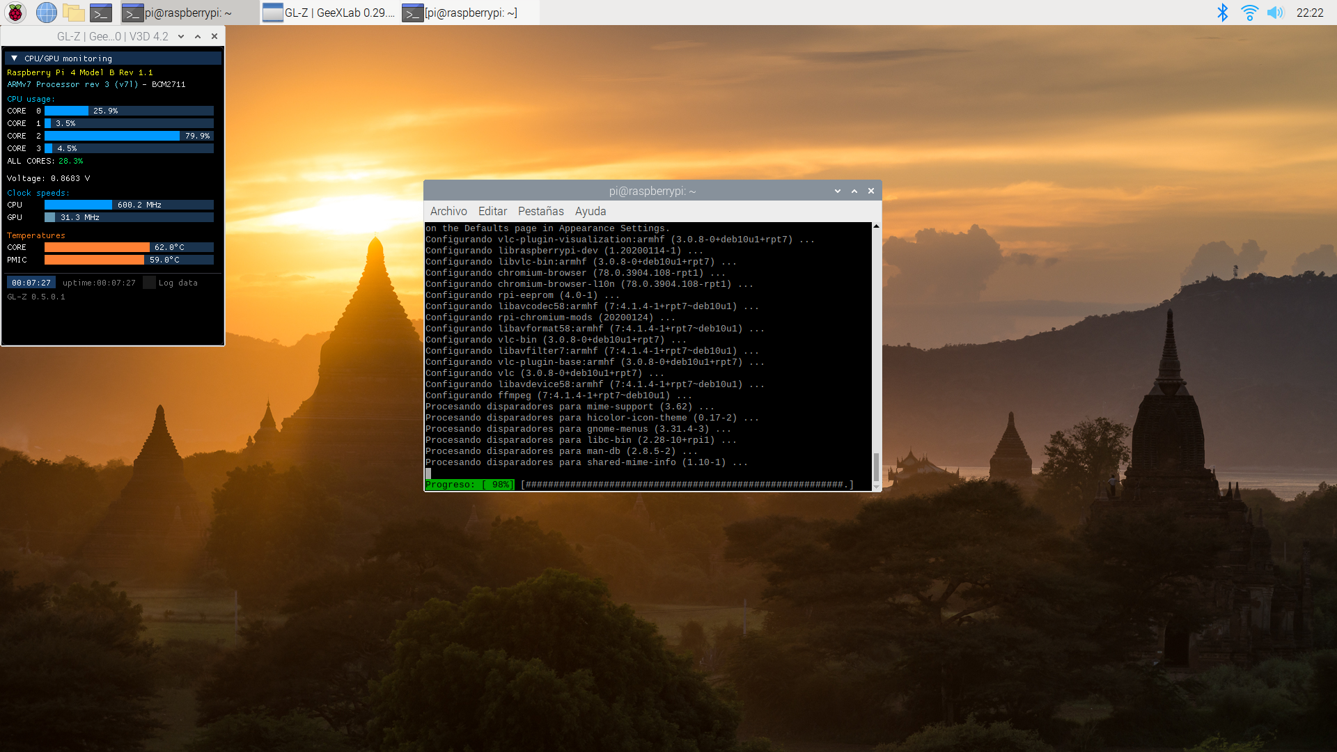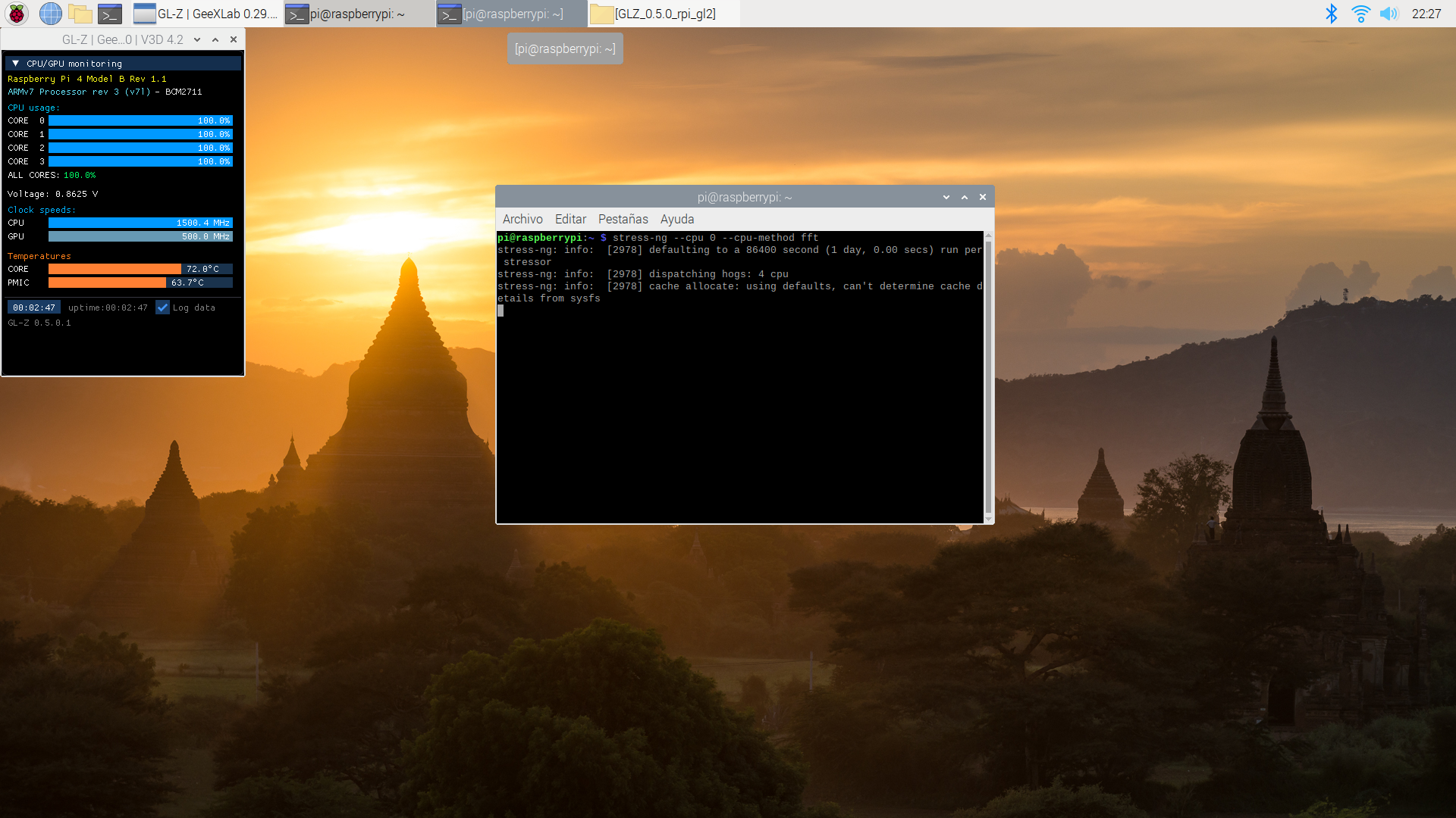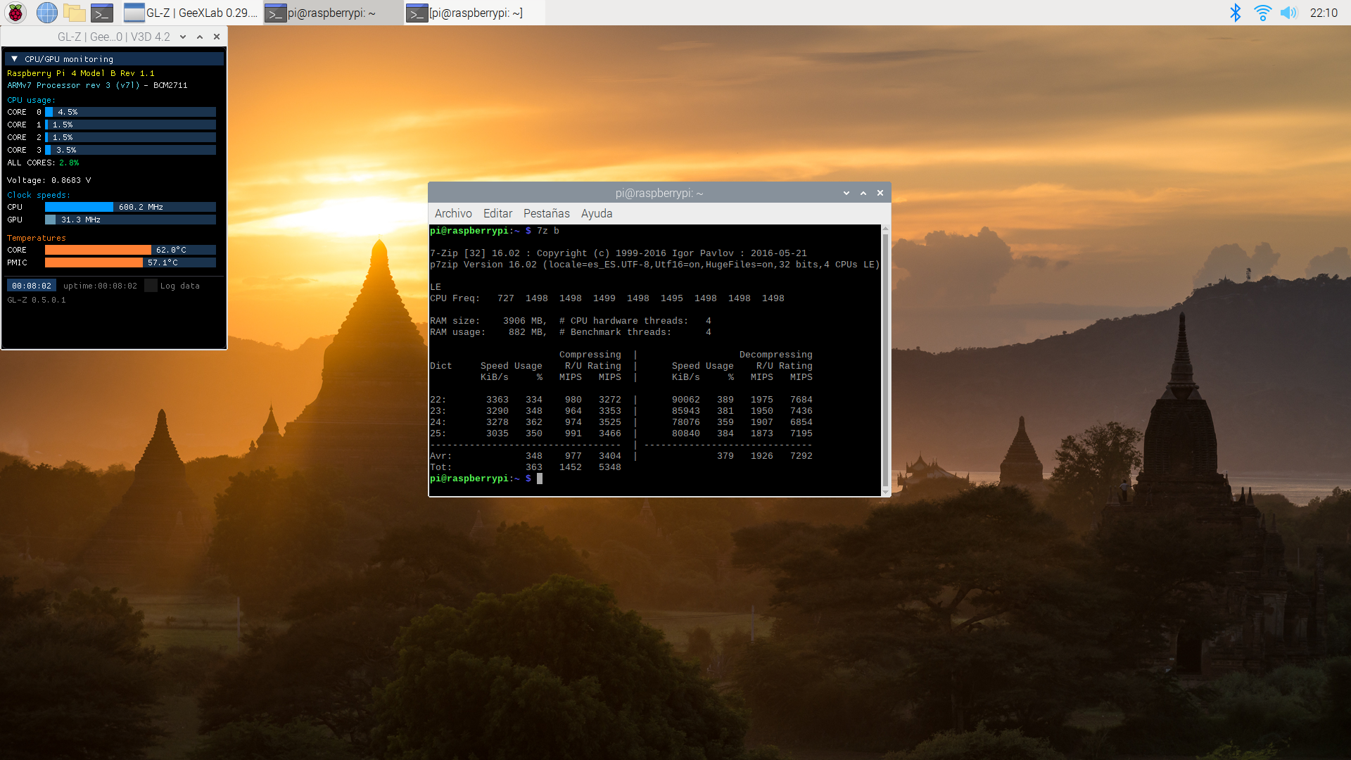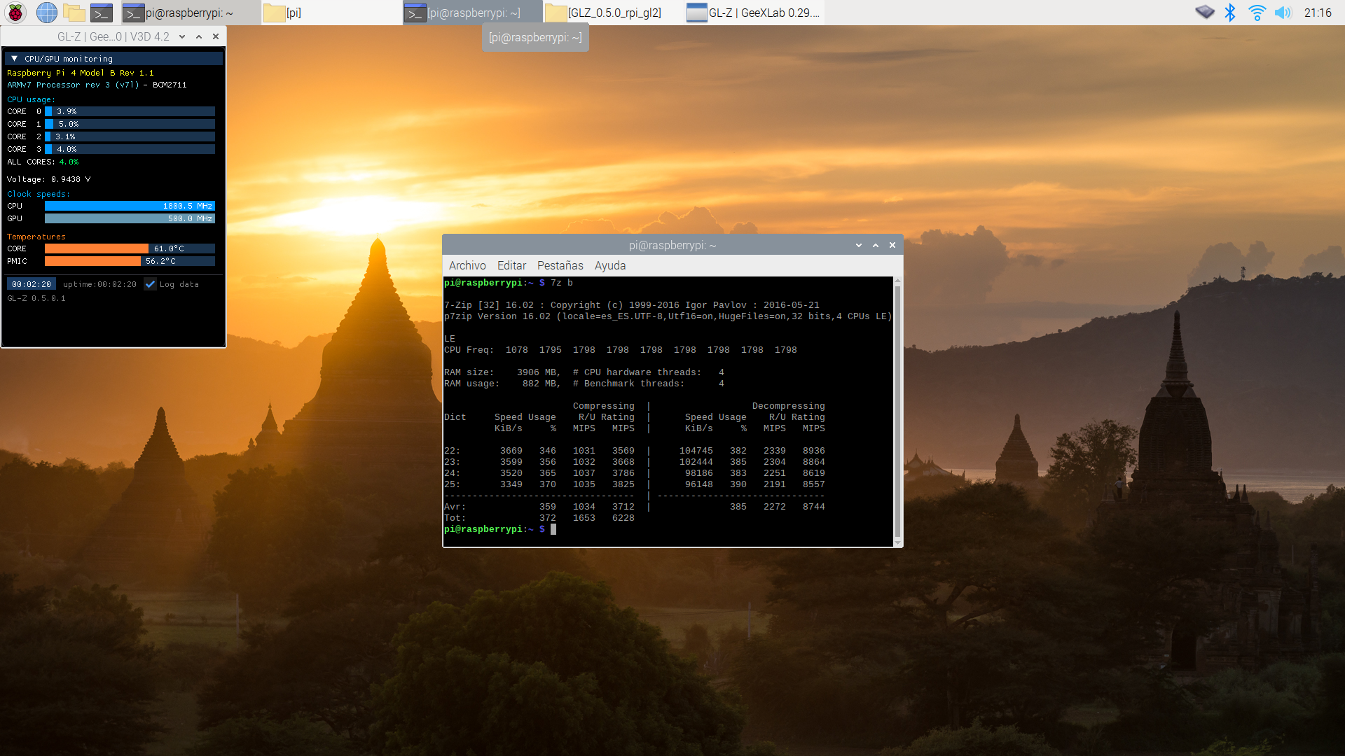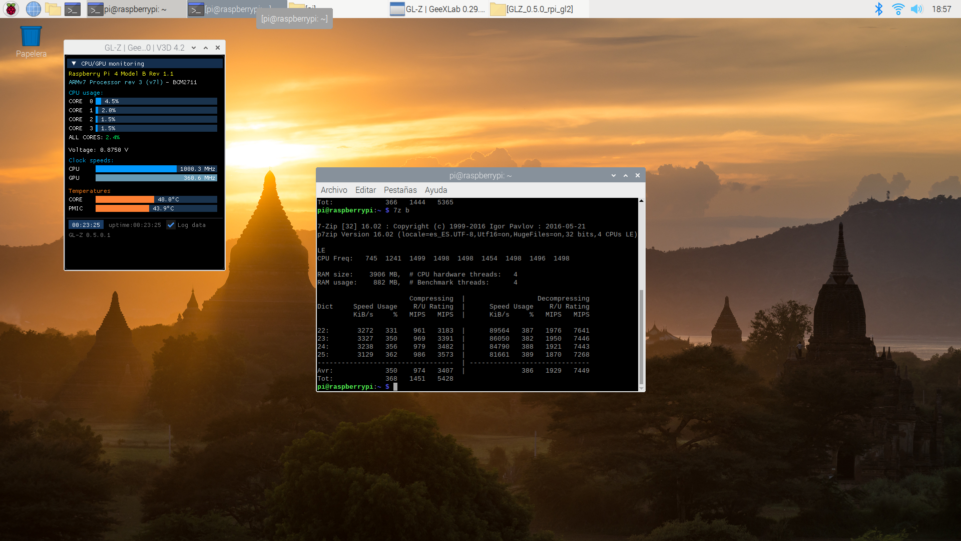 También vamos a comprobar cómo de estable es al forzar y hacer que se caliente más con tres aplicaciones: stress-ng, glxgears (incluido en el paquete mesa-utils y 7z (con la opción b que hace un benchamark con el programa de compresión de archivos p7zip-full).
