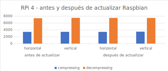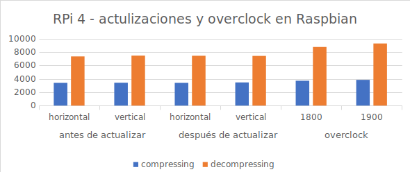 Los gráficos de barras finales, son los resultados del test con 7z b que podéis hacer con vuestra Raspberry Pi para comparar. Las actualizaciones parece que en general permiten que todo vaya más fresco aunque no rinde mucho más, o al menos no se nota mucho. Sin embargo, pasar a 1900MHz en vez de 1500MHz si que ha movido los números. Pasamos desde unos 7292 hasta 9268 en descompresión que es la prueba más favorable. Así que en teoría se puede mejorar el rendimiento hasta en un 25%.