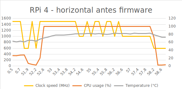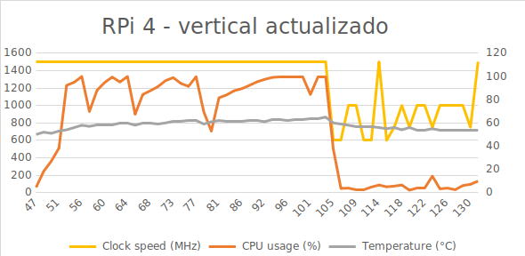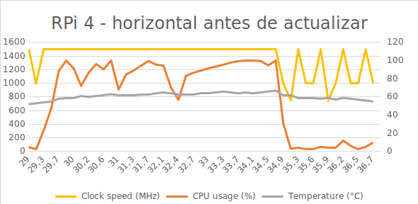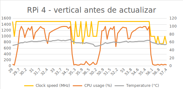 A continuación, os incluyo todas las gráficas de rendimiento en las distintas pruebas. Además del registro temporal de como cambiaba la temperatura al hacer las pruebas. Además de probar con y sin actualizar el firmware, también se probó antes y después de actualizar a la nueva versión de Raspbian de febrero de 2020: A new Raspbian update