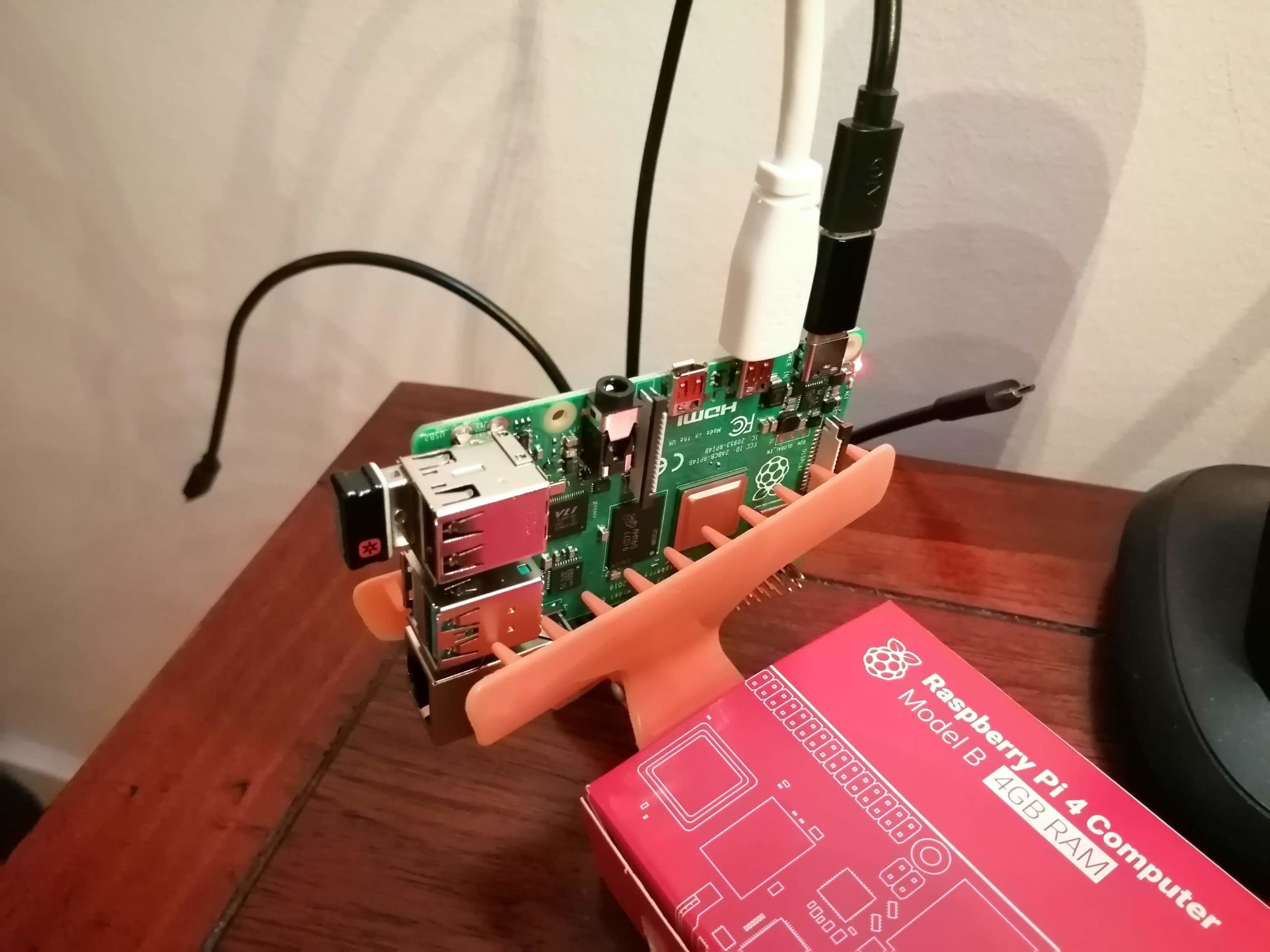 Como lo anterior me parecía poco, he probado esa nueva mágia de poner la Raspberry Pi 4 en vertical (Free Raspberry Pi 4 cooling stand with The MagPi 90!). Ponerla de esa forma es bastante incómodo para los cables, aunque si lo que haces es usarla como servidor headless (sin pantalla conectada) lo mismo está bien.