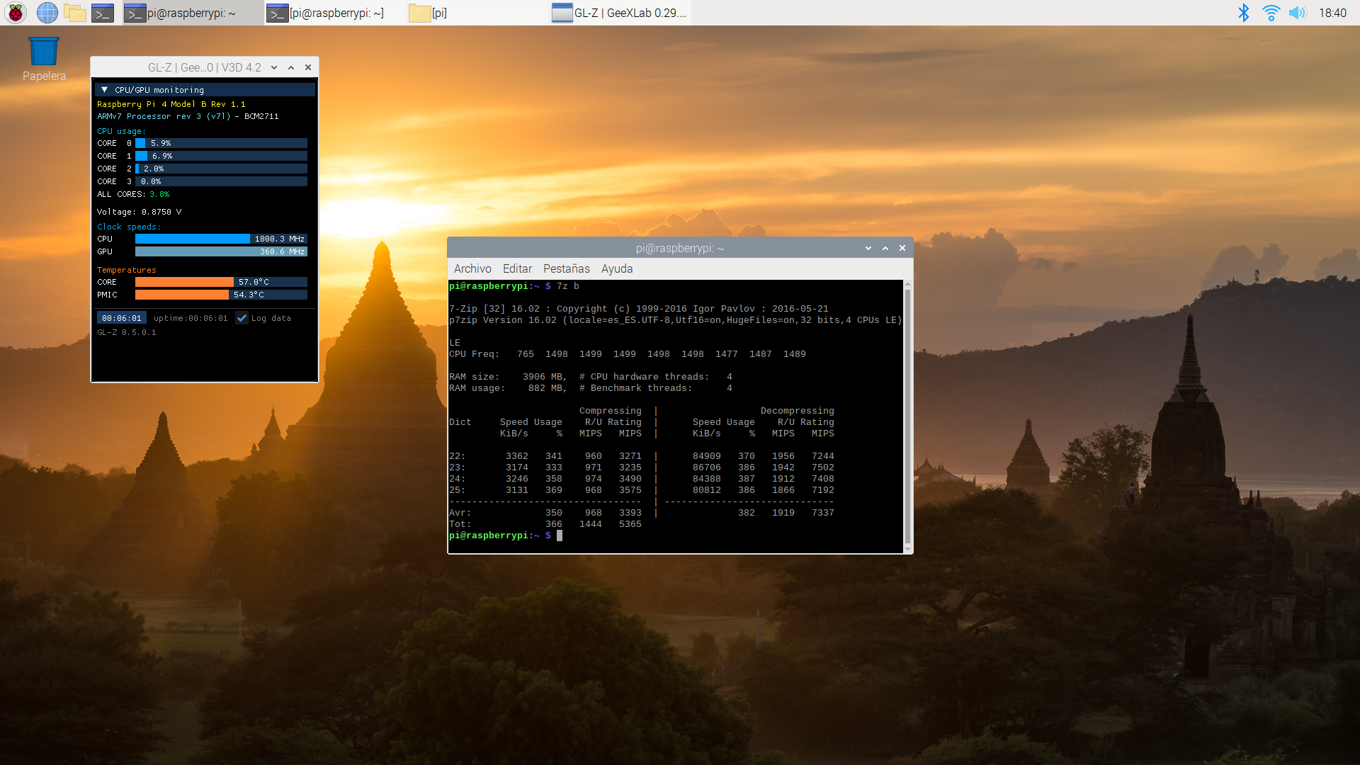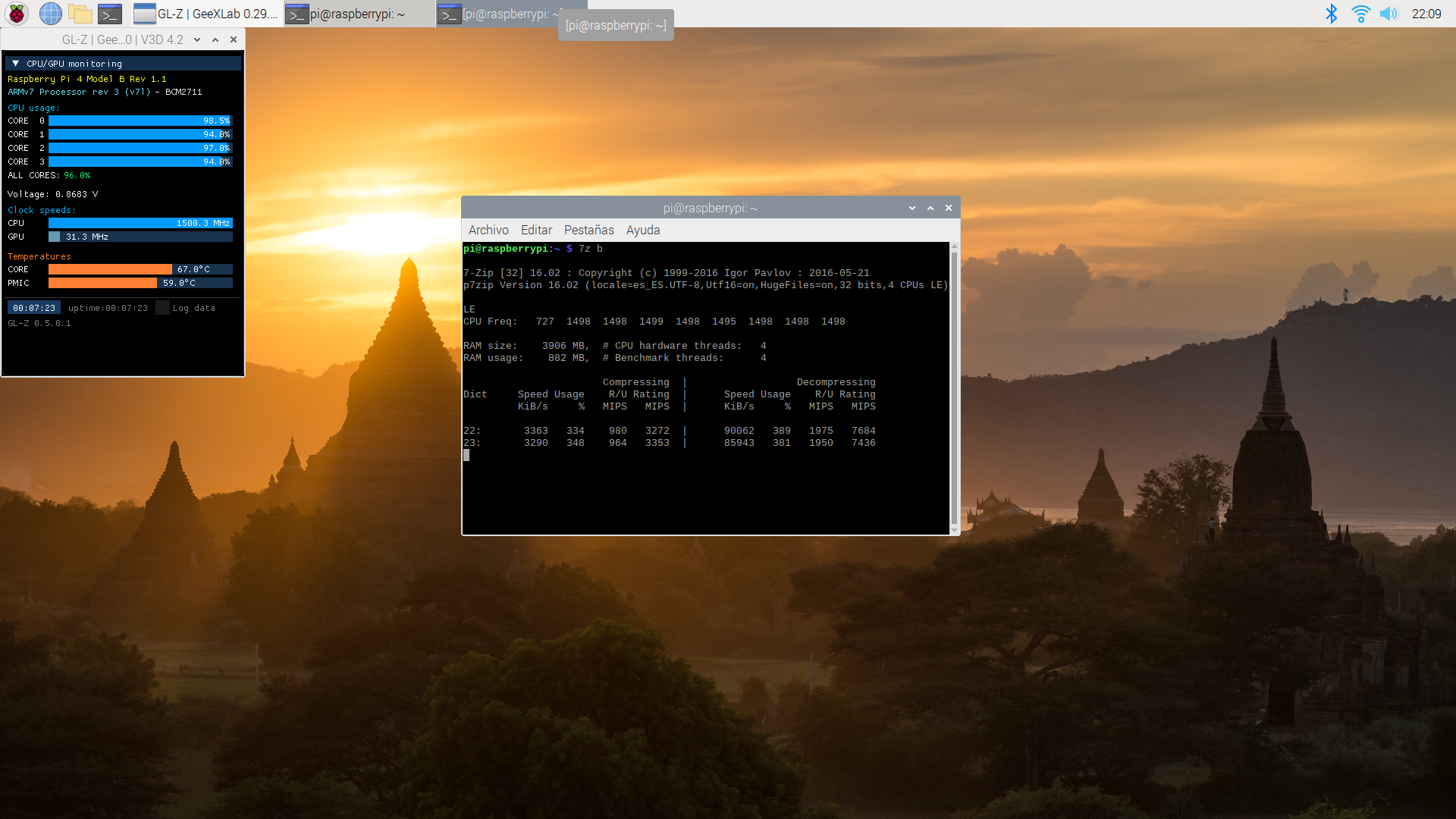 También vamos a comprobar cómo de estable es al forzar y hacer que se caliente más con tres aplicaciones: stress-ng, glxgears (incluido en el paquete mesa-utils y 7z (con la opción b que hace un benchamark con el programa de compresión de archivos p7zip-full).