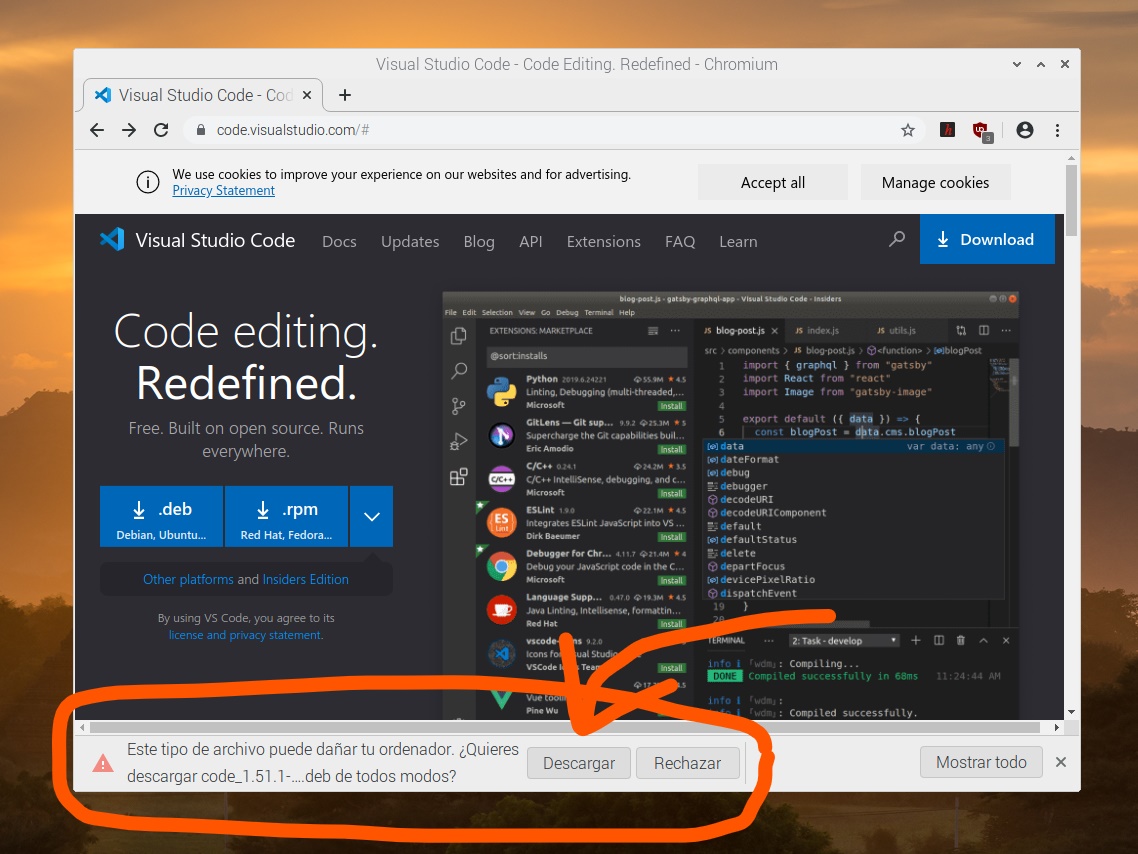 Este tipo de archivo puede dañar tu ordenador. ¿Quieres descargar code_1…..deb de todos modos?