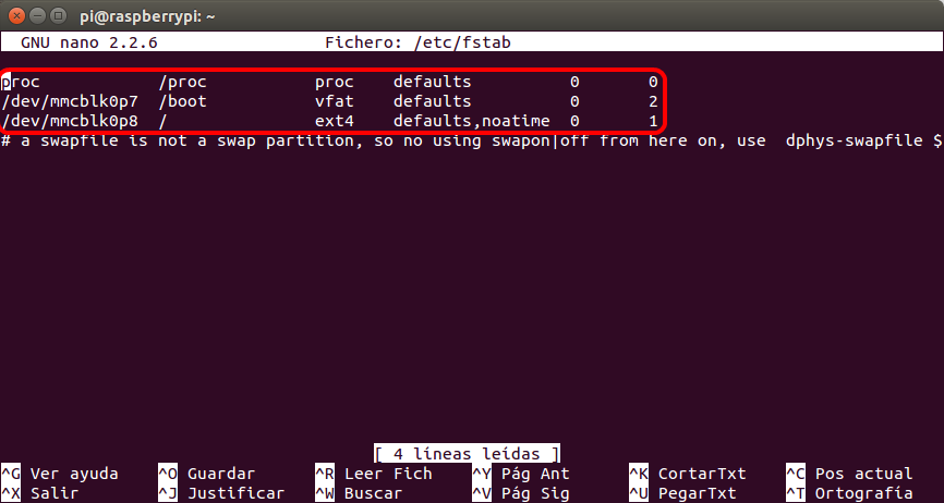 Con el código que copiamos al principio o viéndolo de nuevo, vamos a editar el fichero de la configuración de discos de la Raspberry Pi