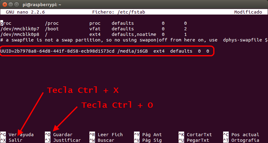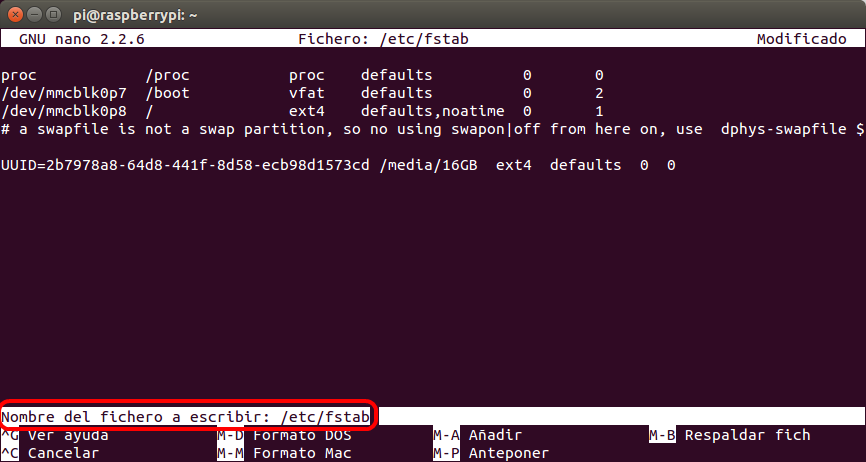 La nueva línea debe quedar como en la imagen. Dependerá del código «UUID» que tenga vuestro disco o memoria USB y la carpeta que creamos antes «/media/16GB» . Si lo hicimos con sudo blkid /dev/sda1 >> /etc/fstab solo habrá que completar por delante con UUID= y por detrás con el resto de información tal como se ve en el siguiente comando: