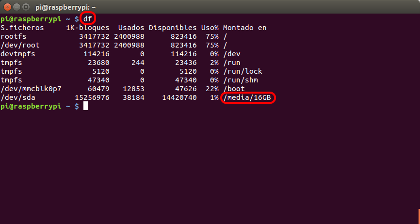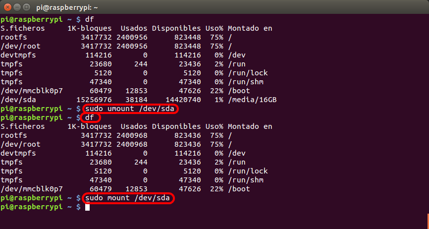 Con el disco duro o memoria USB conectada tecleamos en una Terminal local o remota los siguientes comandos: