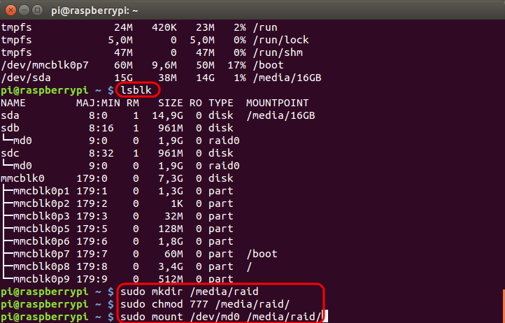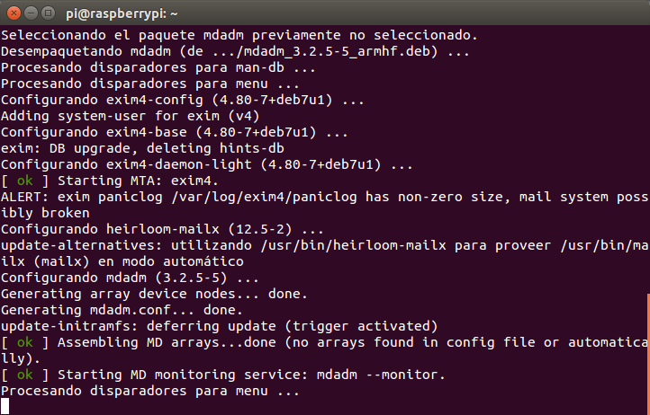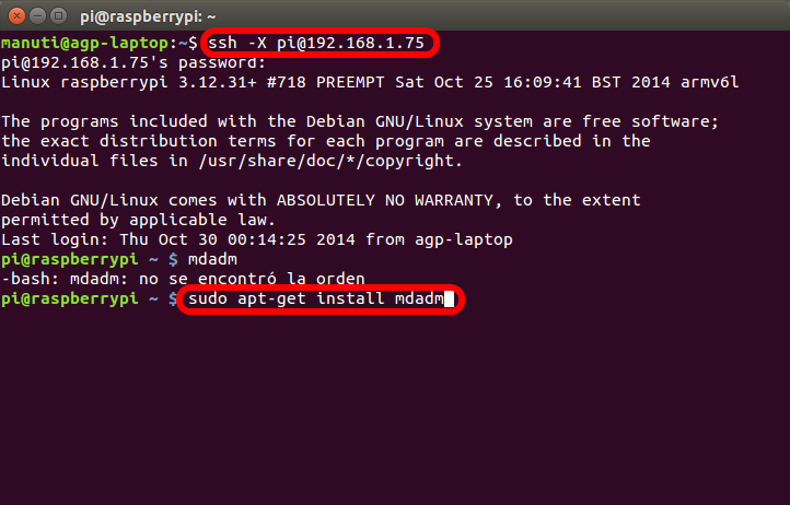 Todo lo necesario lo he sacado de esta excelente guía: RAID por software en Debian 7 con mdadm. Yo solo la he aplicado a la Raspberry Pi. Para empezar, entramos a la Raspberry por Terminal
