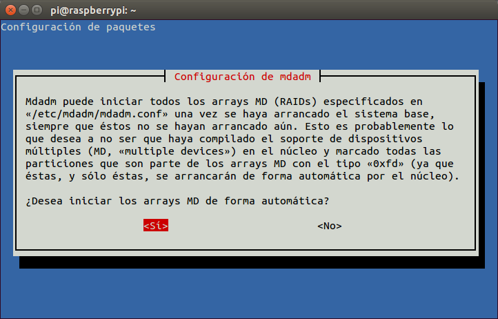 - La primera es si queremos que el software RAID arranque al principio de todo para instalar ahí el sistema operativo. A lo que tenemos que contestar que no, pero que si leemos el texto se hace indicando:
