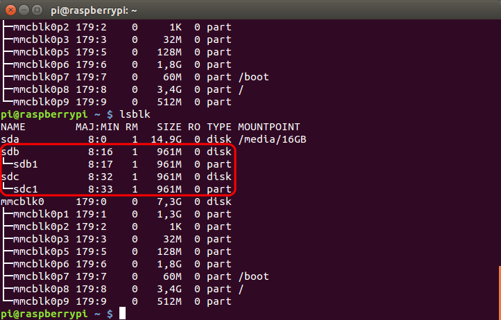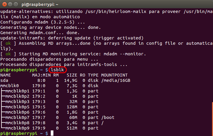 Comprobamos los discos disponibles en la Raspberry Pi usando la orden: lsblk
