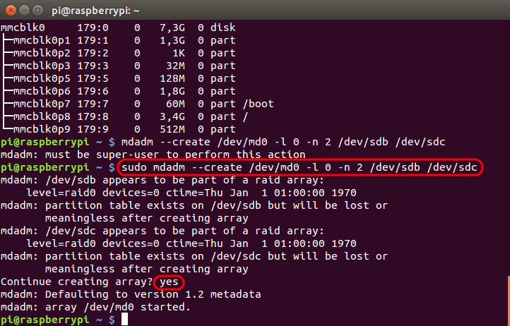 sudo mdadm --create /dev/md0 -l 0 -n 2 /dev/sdb /dev/sdc