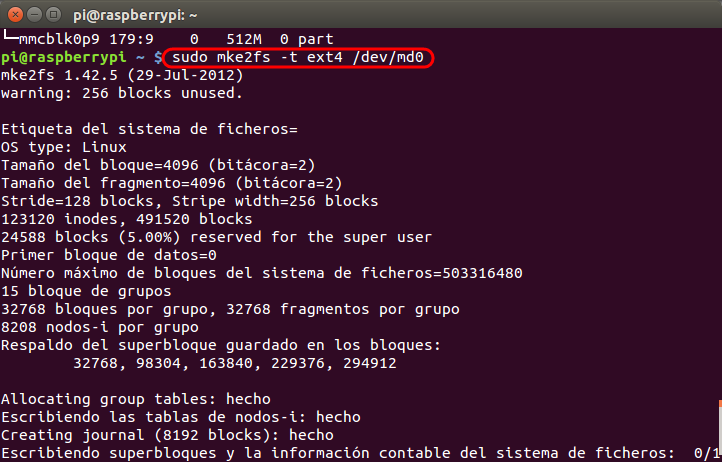 A partir de aquí todo es igual que lo expliqué en la guía para montar un NAS casero. Ahora formateamos el nuevo disco: sudo mke2fs -t ext4 /dev/md0