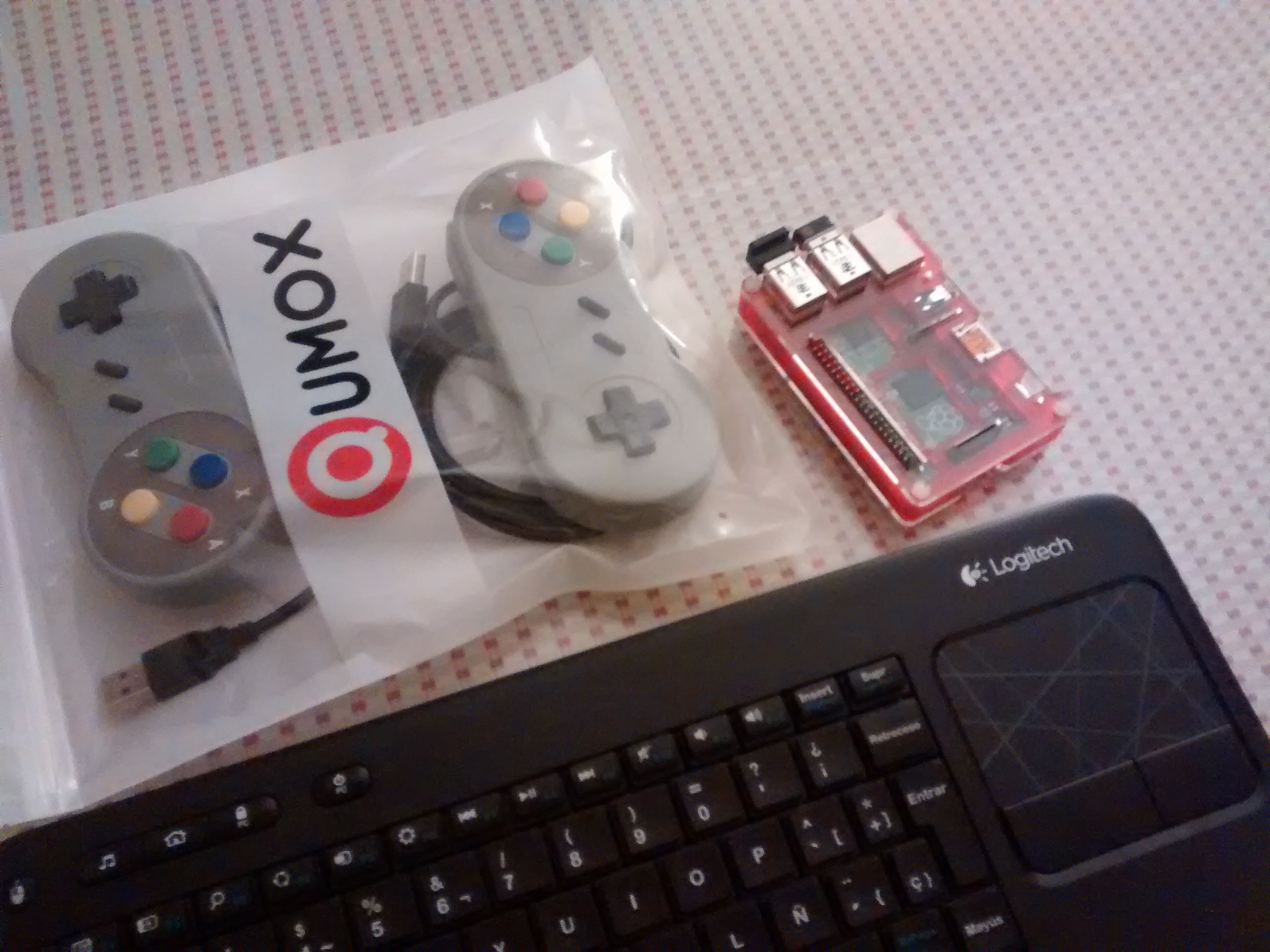 A lo que vamos, hubo que hacer una pequeña inversión en mandos. Yo compré una copia barata de los originales de SuperNES, ya que los iba a usar con una Raspberry Pi B+, no un modelo nuevo Raspberry Pi 2, y conociendo que es más corta de potencia no esperaba emular ni PSX ni Nintendo64. Además de los mandos necesité un teclado, algo que no esperaba pero es que no hay otra forma de resetear la consola que no sea dándole a la tecla Escape. La lista de la compra es:
