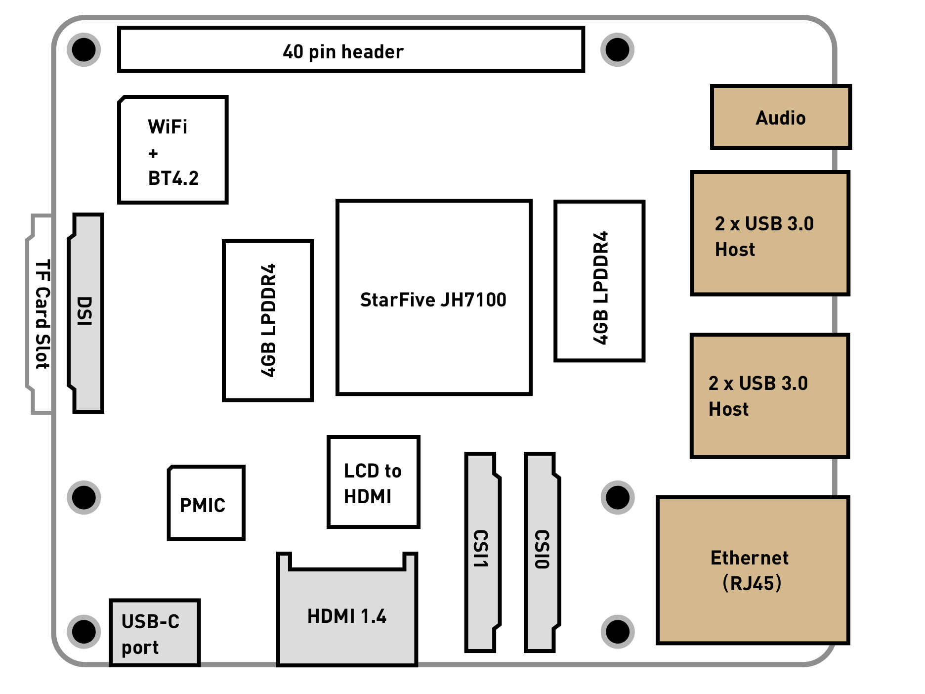 - CPU: SiFive U74 RISC-V de doble núcleo con 2MB de caché L2 a 1,5GHz