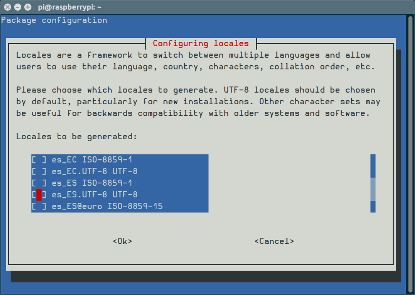 lo seleccionamos con la tecla Espacio o barra espaciadora. Luego con la tecla Tab o tabulador seleccionamos <OK> y pulsamos Enter o Return o Intro. Ahora vuelve a aparecer un menú con varias opciones de idiomas pero más corta. Hacemos lo mismo. Cursores o flechas hasta es_ES.UTF-8 y luego con el tabulador seleccionamos <OK> y finalmente Enter.